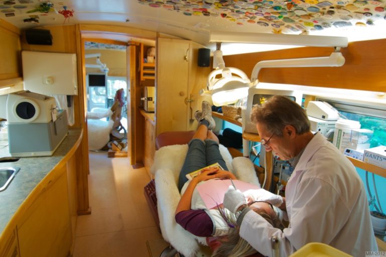“It’s swank,” Walford said with a laugh. The bus is a work of Hornby art: it’s finished in birch plywood and yellow cedar with teak accents and 500-year-old bits of yew wood. It has two dentist chairs and in-floor heating—and on nice days, Walford opens the windows and doors to let fresh air flow through as he works on patients’ teeth.
